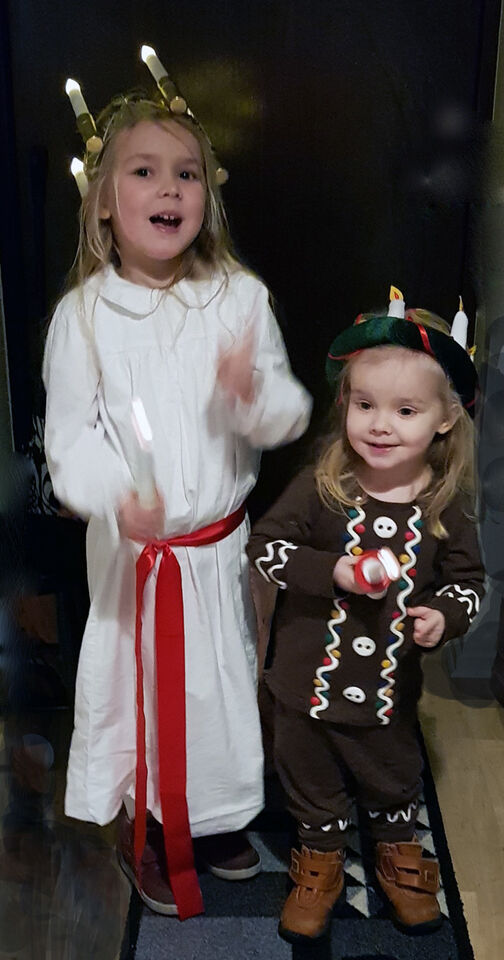 Jag måste få berätta tidigt på morgonen blev jag o Jonen överraskade av denna sjungande Lucian och hennes pepparkakstös. Jag vill göra en blogg för att bevara bilden här som ett rart minne.